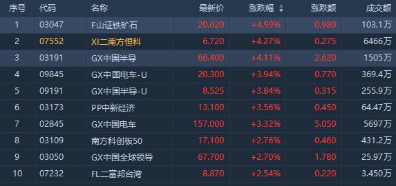 从ETF涨幅榜来看,今日涨幅位居前的ETF有F山证铁矿石ETF涨4.99%,成交额103.1万港元。