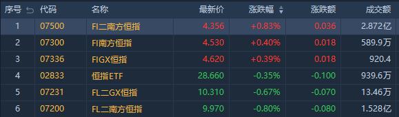 受消息影响,今日港股涨幅居前的ETF有南方两倍看空恒指(07500.HK),收涨0.83%,成交额2.87亿港元;