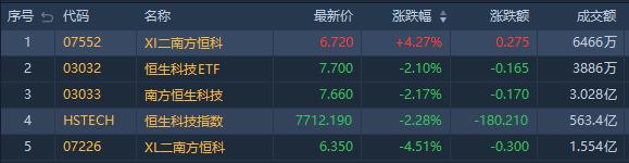 看多恒指相关ETF走弱,南方两倍做多恒科(07226.HK)跌4.51%,成交额约1.55万港元;南方恒生科技(03033.HK)跌2.17%,成交额约3.03亿港元;