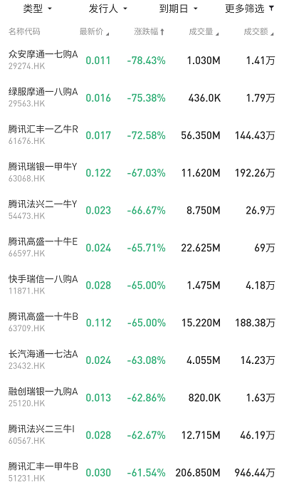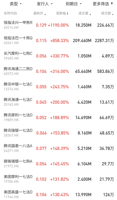 涨幅居前的包括:恒指法兴一甲熊R暴涨1190%,占据排行榜第一;恒指法巴一十熊Q涨858.33%;长汽摩利一七购C涨330.77%。