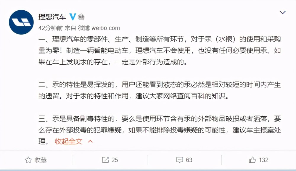 理想汽车:理想ONE在产品设计、原材料选择、生产制造、运输以及交付环节,不会也没有必要使用汞;疑似“水银”的物质是外部原因进入车内,将配合警方以及车主调查取证。