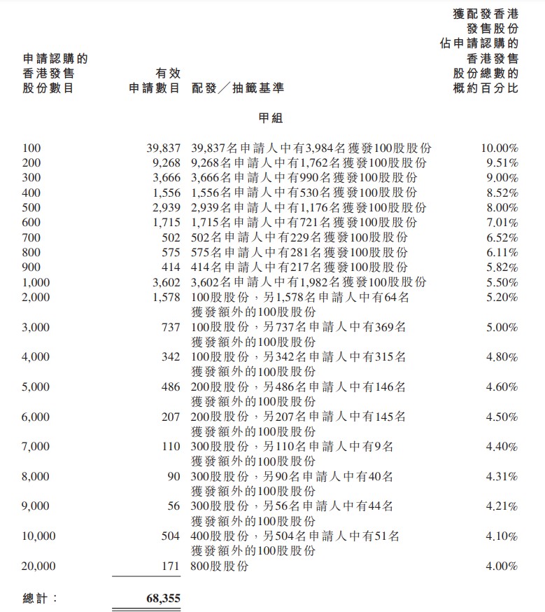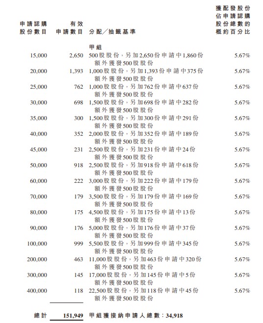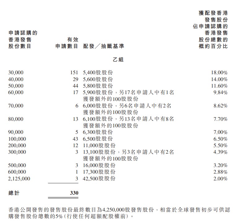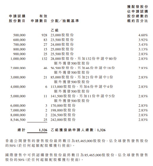 据香港公开发售合共接获36244份有效申请(包括以白色及黄色申请表格以及透过中央结算系统向香港结算发出电子认购指示及通过白表eIPO服务提出的申请),涉及8546.5万股合共股香港发售股份,相当于根据香港公开发售初步可供认购的香港发售股份总数1709.3万约113.97倍。
