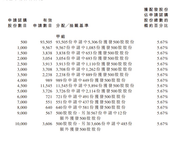 公开发售一手中签率为5.67%,申购18手稳获一手(500股)。