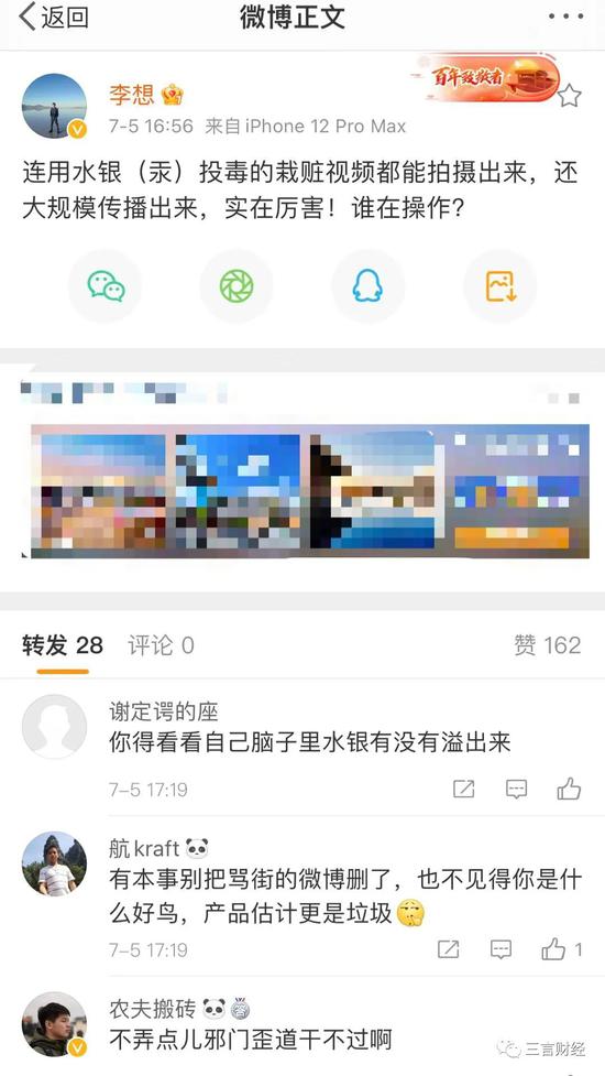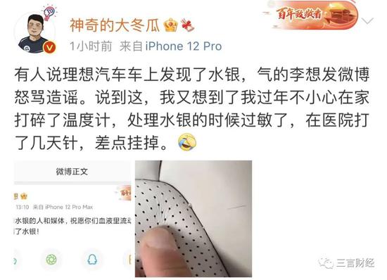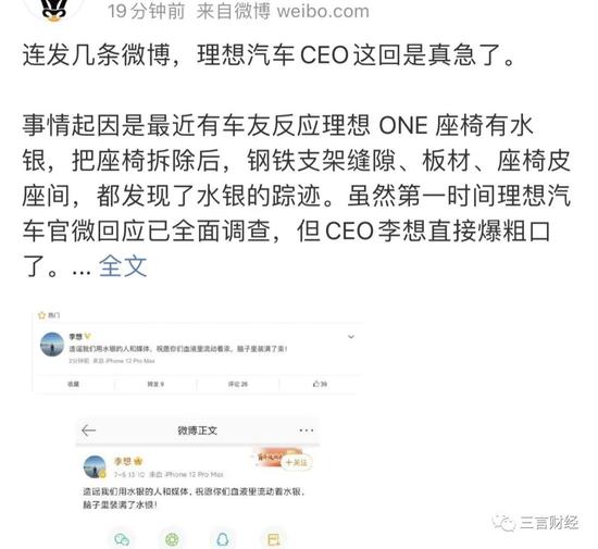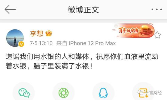 李想称,“造谣我们用水银的人和媒体,祝愿你们血液里流动着汞,脑子里装满了汞!”