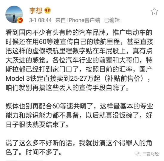 李想称,“看到国内不少有头有脸的汽车品牌,推广电动车的时候还在用60等速宣传自己的续航里程,甚至直接把这样的虚假续航里程数字贴在车屁股上,真有点大跃进的感觉。各位汽车行业的前辈和大哥们,特斯拉都已经打到家门口了,按照目前的汇率,国产Model 3铁定直接卖到25-27万起(补贴前售价),咱们就别再搞这些丢人的宣传手段自嗨了。”