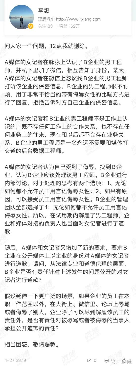 所以这件事就变成了李想在处理这件事上遇到了困惑,所以想征求下大众的看法。