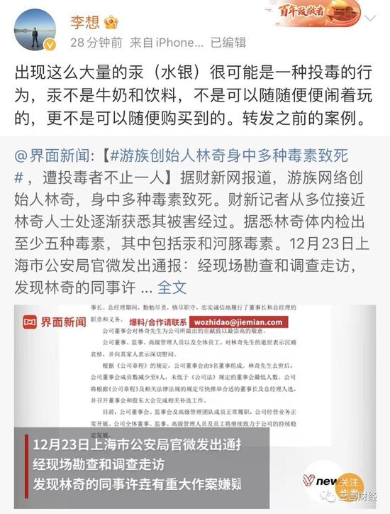 第二条微博,李想转发了此前游族创始人被投毒的新闻,并指出出现大量的水银很可能是投毒的行为,“汞不是牛奶和饮料,不是可以随随便便闹着玩的,更不是可以随便购买到的”。