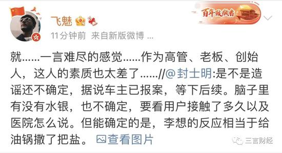 对于李想这样的反应,有网友说李想“真急了”;还有人认为作为高管、老板、创始人,李想的“素质太差了”。
