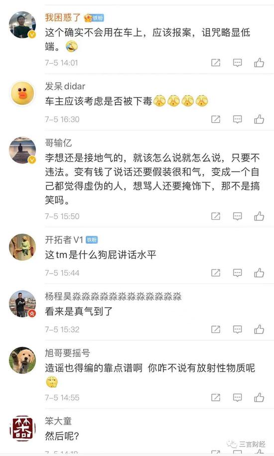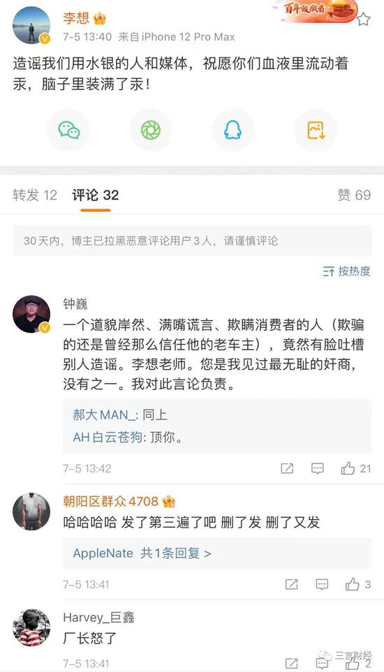 在这条微博下,有网友直怼李想,“一个道貌岸然、满嘴谎言、欺瞒消费者的人(欺骗的还是曾经那么信任他的老车主),竟然有脸吐槽别人造谣。我对此言论负责。”