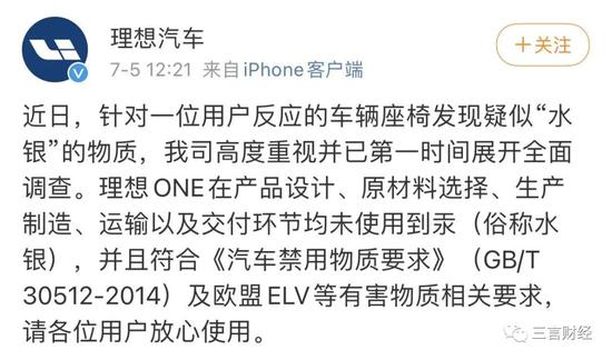 理想汽车表示:理想ONE在产品设计、原材料选择、生产制造、运输以及交付环节均未使用到汞(俗称水银),并且符合《汽车禁用物质要求》(GB/T 30512-2014)及欧盟ELV等有害物质相关要求,请各位用户放心使用。