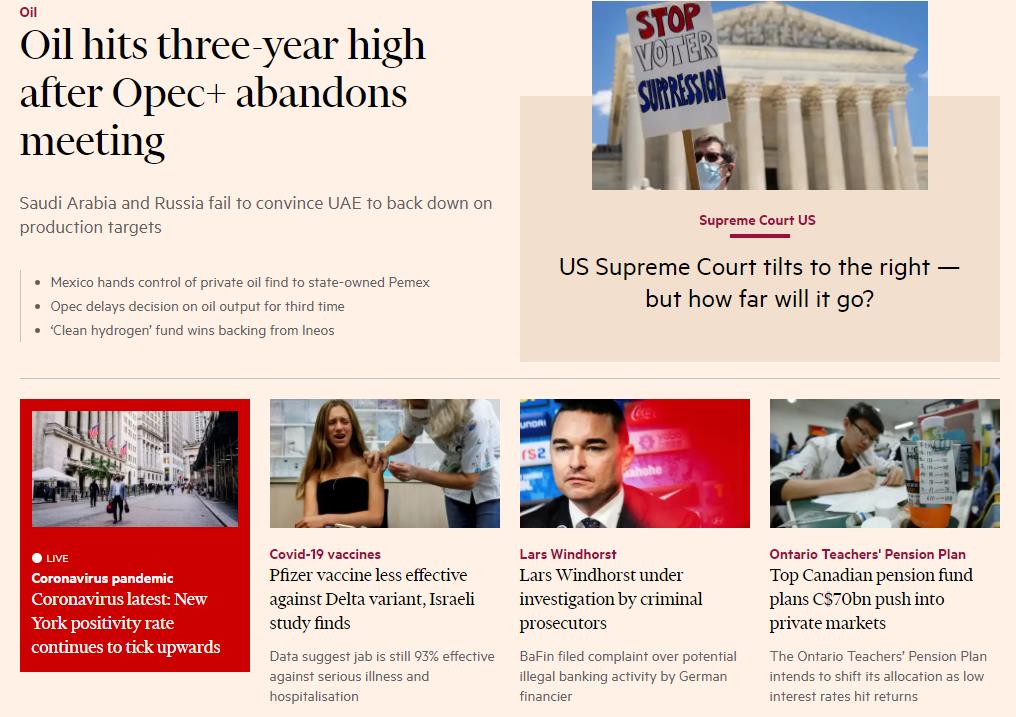 石油输出国组织(OPEC)+周一进行了第三次尝试,却仍未能达成协议,取消了召开会议的计划,令石油市场的供需情况比预期更加紧张。与会代表表示,连续数日的紧张会谈后,沙特与阿联酋仍然未能解决激烈的争端;因信息未公开,知情人士要求匿名。由于没有达成协议,OPEC+将继续实施当前的限产措施,石油需求在疫情后逐步复苏之际,全球经济却难以获得额外的能源供应。OPEC秘书长Mohammad Barkindo在声明中称,该联盟未能就下次会议时间达成共识。此次会谈破裂未能达成协议,最直接的影响是OPEC+不会在8月份增产,意味着在石油需求从疫情冲击中迅速复苏之际,全球经济却难以获得额外的能源供应。消息传出后,国际油价上涨,续创近三年来新高。
