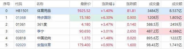 华盛资讯7月6日消息,体育用品板块早盘逆市走高,截止发稿,特步国际上涨6.3%,股价高见15.20港元,再度刷新历史高价,361度上涨3.47%;李宁上涨3.01%;中国动向上涨1.48%;安踏体育上涨0.9%。