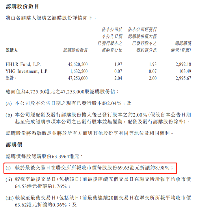 认购价为每股认购股份63.3964港元,认购价较最后交易日(7月2日)69.65港元折让约8.98%。