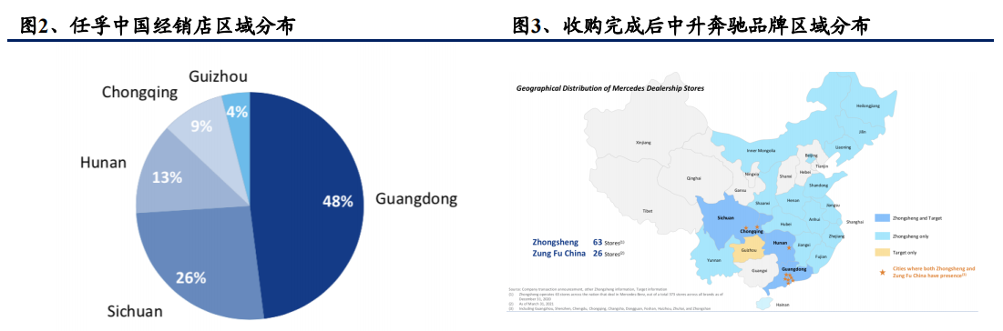 收购还可以强化中升控股的品牌+区域聚焦战略,在奔驰经销网络的份额将从12%升至18%,估计公司在华南和华西地区奔驰的市占率提高到约30%。
