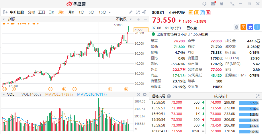 在官宣高瓴资本大手笔投资中升控股后,中升控股股价在7月5日一度大涨超过10%,但随后由于大盘环境影响尾市涨幅有所回落。