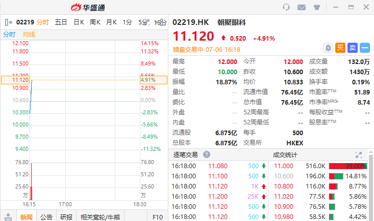 朝聚眼科(02219.HK)涨逾4%,当前成交额2000万港币,最新总市值超72亿港币;