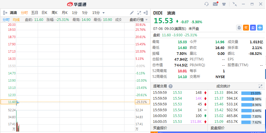 其中,滴滴(DIDI)盘前大跌超25%,报11.6美元,跌破其14美元/ADS的发行价,此前滴滴出行App因存在严重违规收集使用个人信息问题而被下架。