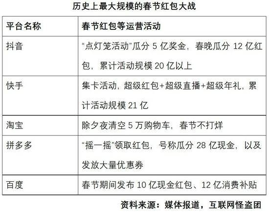 2021年春节期间,在“就地过年”的号召之下,大量年轻白领用户留在一线城市过年;互联网平台将其视为一个千载难逢的“拉增长”良机。以前每一年的春节,各大平台都会推出巨额红包活动,今年的红包规模是历史上最大的,有些平台甚至翻了一倍多。头部APP图标纷纷显示“分20亿”“分21亿”乃至“分28亿”,成为社交媒体纷纷转载的奇景。