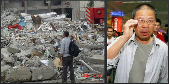 左:钟睒睒在灾区;右:钟睒睒救灾回来在机场哭泣