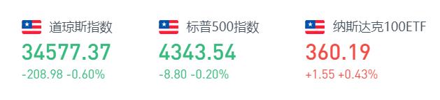 截至收盘,纳斯达克综合指数涨24.32点,涨幅0.17%,报14663.64点;道琼斯指数跌208.98点,跌幅0.6%,报34577.37点;标普500指数跌8.8点,跌幅0.2%,报4343.54点。
