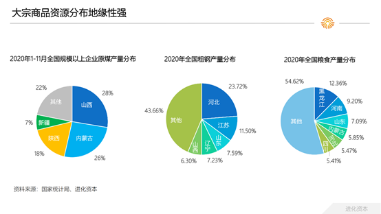 大宗商品在我国的地区性分布并不平均,有较强的地缘性。我国2020年1-11月生产的近35亿吨原煤,主要分布在山西、内蒙古、陕西等三地,分别占比28%、26%和18%。同样,钢铁和粮食的产量也呈现明显的地域特征,如钢铁主要在河北、江苏、山东和辽宁等,粮食主要分布在黑龙江、河南和山东等地区。