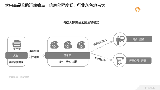 ② 大宗商品公路运输行业信息化程度低,发货人需要通过信息部确认承运物流公司或车辆,寻找运力效率低。由于双方大多是一次性合作且往往凑不成整车,运输成本高。物流运力供给和运输需求的链接中间环节长,运费从货主方经过层层转包流程,司机利益难以保障。