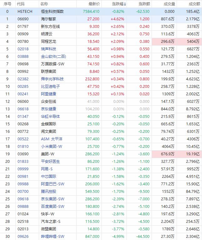 海尔智家上涨4.62%;新东方在线上涨2.65%;明源云上涨2.12%;同程艺龙上涨2.09%;瑞声科技、金山软件、万国数据等个股微涨。