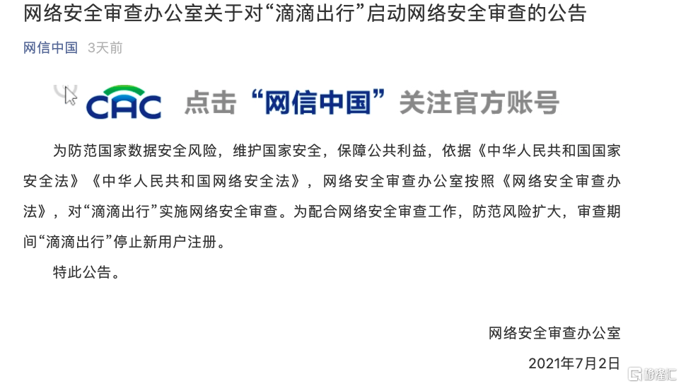 7月2日,刚刚上市2天的滴滴就爆出被网络安全审查办公室审查的消息,并被检测核实存在严重违法违规收集使用个人信息问题。