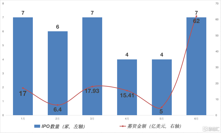图注:2021年上半年每月赴美IPO数量及募资金额