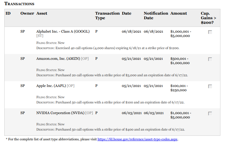 从公开信息来看,佩洛西的丈夫在2021年5月21日花费了25万美元购买了50张行权价为100美元、到期日为2022年6月17日的苹果看涨期权;另外以100万美元买进20张行权价为3000美元、到期日为2022年6月17日的亚马逊看涨期权。