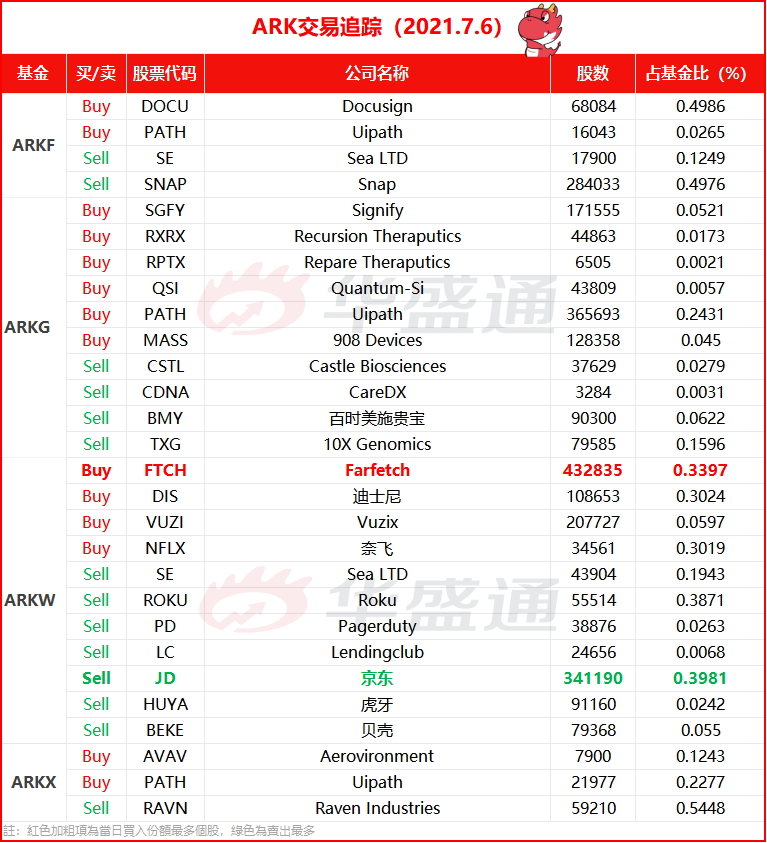 ARK7月6日(周二)共有28笔交易,本日ARK在流媒体公司方面操作较多。