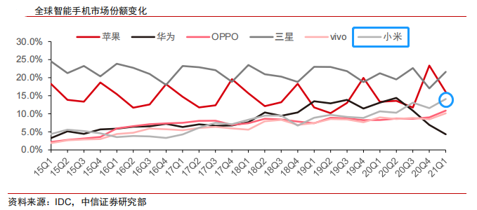而据IDC数据显示,在全球智能手机市场,苹果和三星依然处于明显领先的位置。虽然小米承接了不少华为留下的市场份额,但目前与二者还有一定的距离。