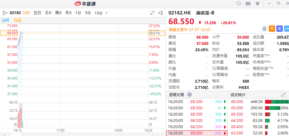 康诺亚生物(02162.HK)大涨28%,一手账面浮盈7700港币,当前成交额9000万港币,最新总市值超186亿港币。
