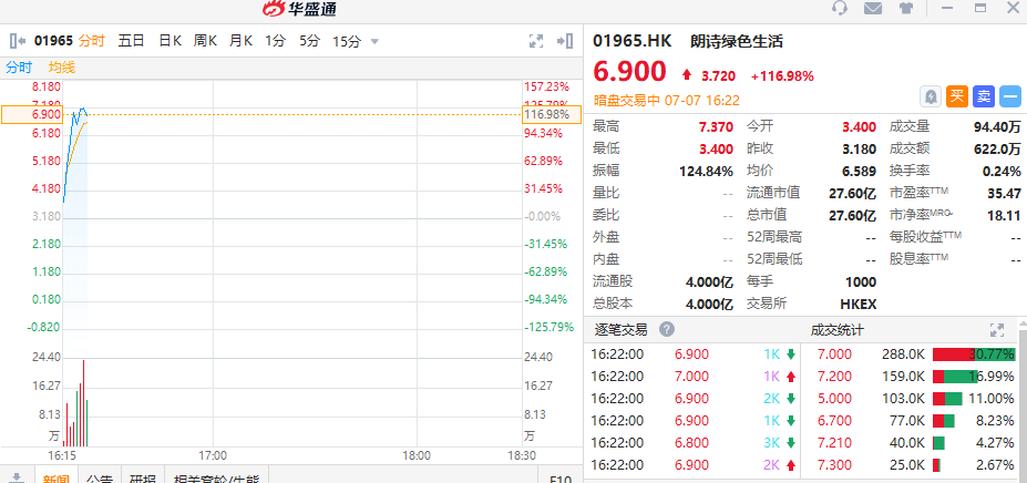 截至发稿,朗诗绿色生活(01965.HK)暴涨120%,一手账面浮盈3720港币,最新总市值超27亿港币。
