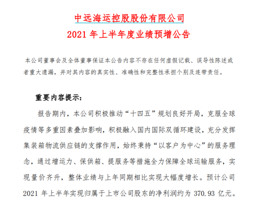 中远海控:预计上半年净利370.93亿元 上年同期11.37亿元