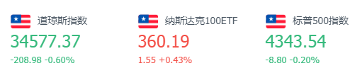 截至收盘,道指跌208.98点,或0.60%,报34577.37点;纳指涨24.32点,或0.17%,报14663.64点;标普500指数跌8.80点,或0.20%,报4343.54点。