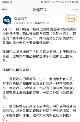 理想汽车(LI)深夜声明:确认座椅上的物质含有水银,理想汽车不会使用水银,或存在外部投毒的犯罪嫌疑