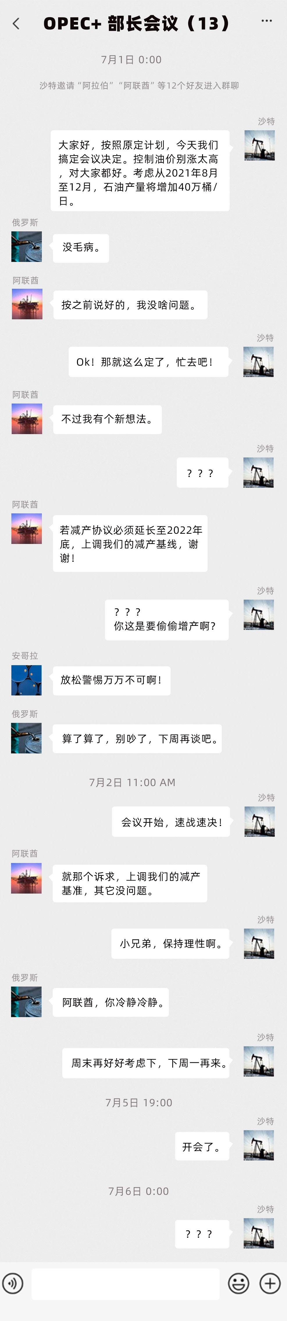 究竟产油国之间“无法调和的矛盾”缘起何处?利益纷争核心在哪?如果与会国之间有聊天群,当时的情况可能是这样的吧: