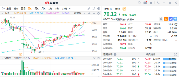 截至发稿,Facebook(FB)涨幅收窄至0.11%,推特(TWTR)微跌0.13%