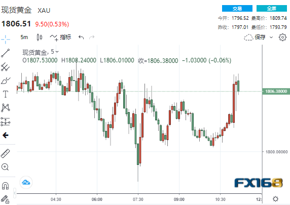 现货黄金短线走高6美元,至1808.24美元/盎司。
