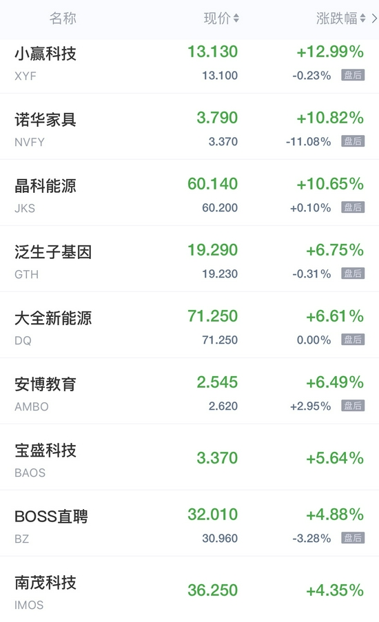 小赢科技涨近13%,晶科能源涨超10%,BOSS直聘涨近5%,微博涨超3%。