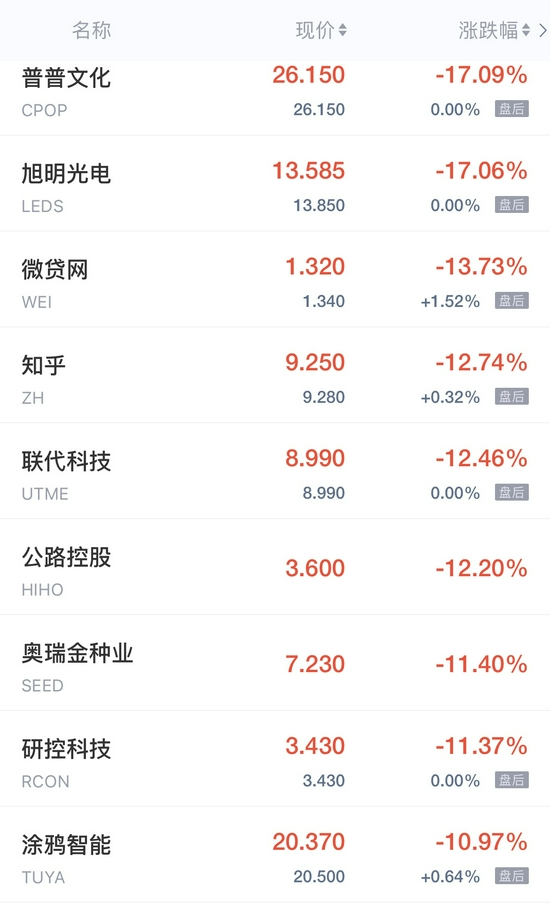 微贷网跌近14%,知乎跌近13%,联代科技跌超12%,涂鸦智能跌近11%,趣头条、第九城市跌超7%,途牛、中网载线、爱奇艺、迅雷跌超6%,哔哩哔哩、猎豹移动、虎牙、瑞幸粉单跌超4%,36氪跌近4%,每日优鲜跌超3%,携程跌近3%,百度、网易跌超2%,阿里巴巴跌近2%,叮咚买菜跌超1%。