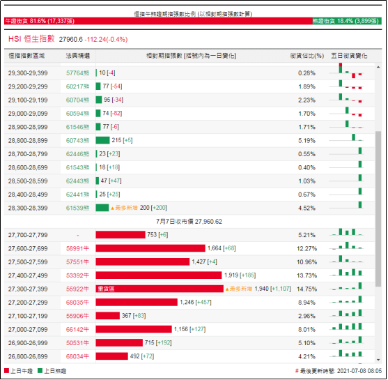 街货分布方面,至周三,恒指牛证街货在收回价27300点至27800点之间,牛证街货量及占比有所增加,相当约7703张期指合约;恒指熊证街货主要贴价区间在收回价28300点至28800点之间,熊证街货量及占比有所减少,累计相当约313张期指合约。
