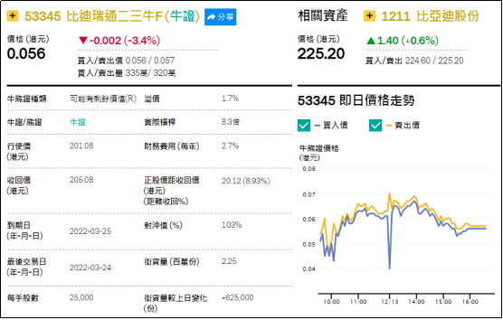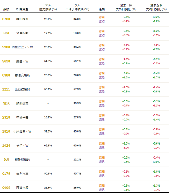 周三恒指相关权证的平均引伸波幅报约19.6%,按日上调0.4个百分点。个股方面,美团、比迪相关认购证的引申波幅下调,快手相关认购证的引申波幅上调3个百分点。
