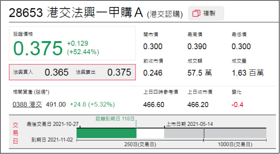1、强势轮证:港交法兴一甲购(28653.HK),周三大涨52.44%;