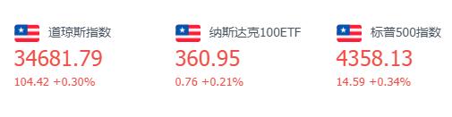 截至收盘,道琼斯指数涨104.42点,涨幅0.3%,报34681.79点;标普500指数涨14.59点,涨幅0.34%,报4358.13点;纳斯达克综合指数涨1.42点,涨幅0.01%,报14665.06点。