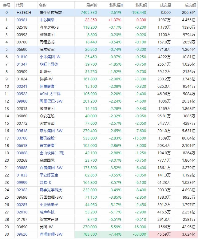 哔哩哔哩-SW跌7.44%;美团-W跌5.59;新东方在线跌5.51%;瑞声科技、比亚迪电子跌5.17%;舜宇光学科技、网易-S、平安好医生、百度集团-SW等跌超3%。