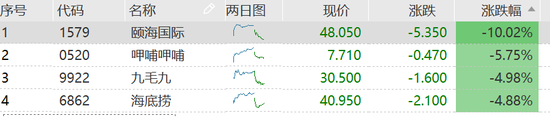 餐饮股集体暴跌,颐海国际跌超10%,呷哺呷哺跌近6%,九毛九、海底捞跌近5%。