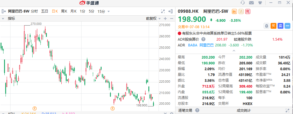 华盛资讯7月8日消息,阿里巴巴午后加剧下跌,现已跌至198.9港元,跌幅达3.35%,暂成交36.48亿港元,最新总市值43141亿港元,创去年6月以来新低。该股较今年最高点309.4港元已累计大跌36%。