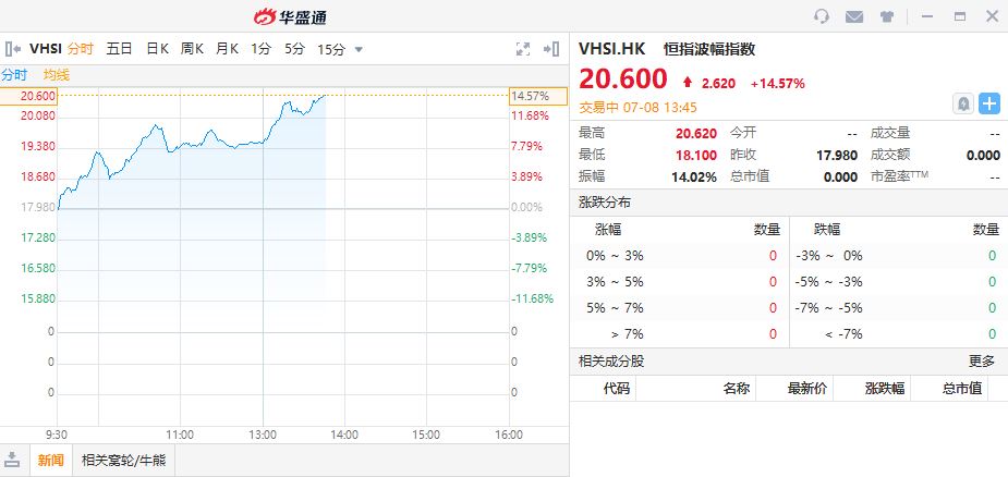 华盛资讯7月8日消息,恒生指数午后持续下行,多头毫无抵抗之力。截止发稿,恒生指数跌2.58%,恒指波幅指数(VHSI.HK)最新为20.60,现涨14.57%。